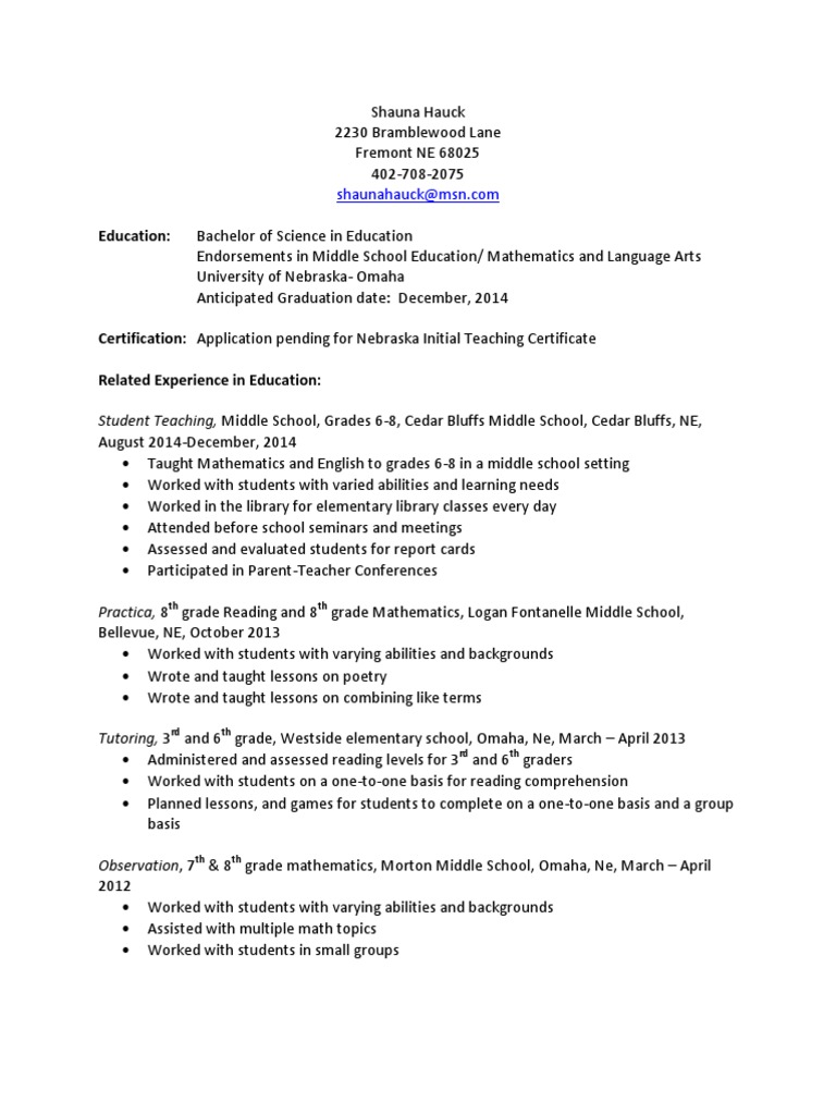 Shauna Hauck Resume 1 Middle Schools Academia