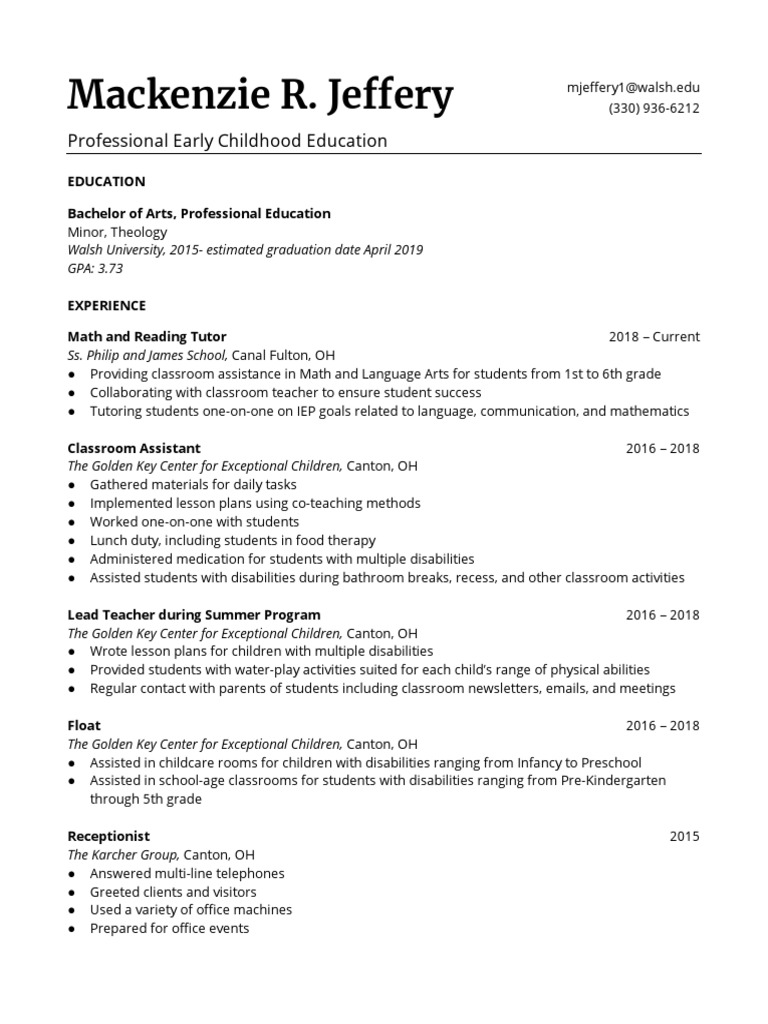 Kenzie Resume Preschool Classroom