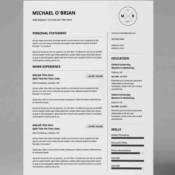 Professional Resume Design Basic Monochrome2 2 Page Template