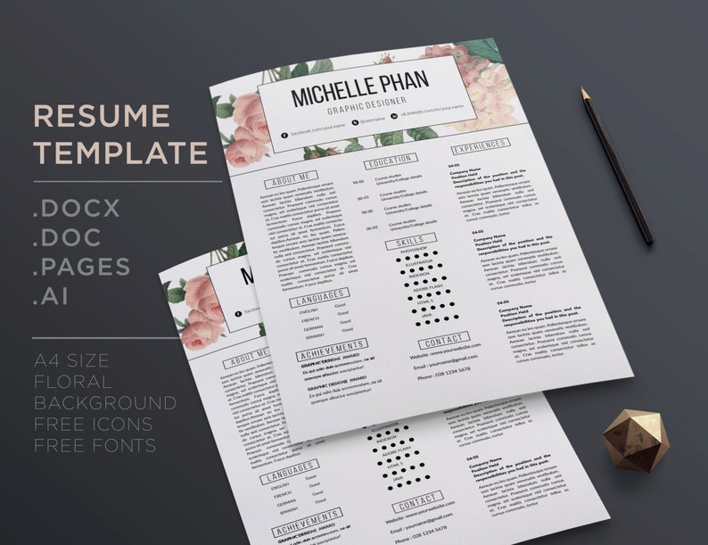 Cv Template 1 Page Resume Cover Letter Elegant Floral