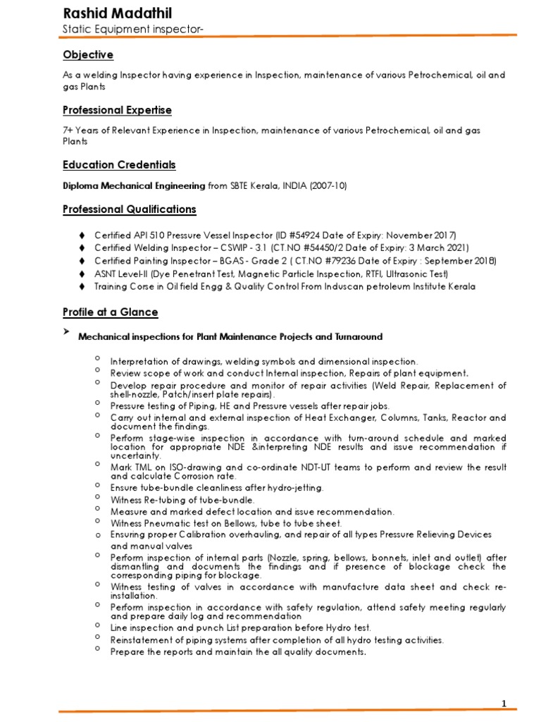 Rashid Cv Equipment Inspector Sep 2017 Pipe Fluid Conveyance