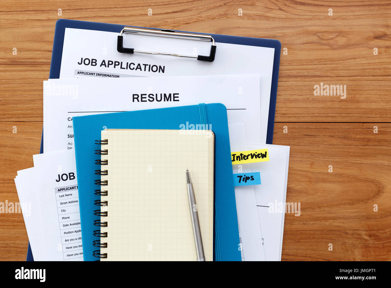 Resume And Job Application With Blank Notebook On Wood Desk Stock