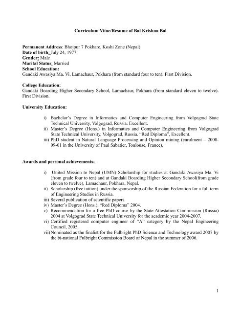 1 Curriculum Vitae Resume Of Bal Krishna Bal Permanent Irit